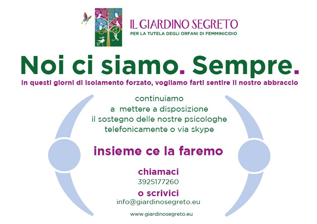 Il Giardino Segreto nasce nel 2015 dalla constatazione di quanto sia diffusa la violenza ai danni dei bambini e degli adolescenti all’interno della famiglia. L’esperienza sul femminicidio ci racconta di figli ai quali viene uccisa la madre, talvolta anche avanti ai loro occhi, spesso con modalità cruente e premeditate; ci racconta di una violenza spregiudicata e senza motivo, fine a se stessa che ha costretto questi figli ad anni di abusi. La morte della madre, talvolta davanti ai loro occhi, è spesso l’epilogo di un dolore che affonda radici nella primissima infanzia, di maltrattamenti, diretti e/o indiretti che hanno fine solo con l’uccisione della loro madre, lasciando però segni profondi. Il Giardino Segreto nasce per aiutare questi bambini, e tutti coloro che si occupano di loro, vittime invisibili del femminicidio. Vorremmo poter restituire a questi bambini quell’incanto e quella protezione di cui nessun bambino dovrebbe mai essere privato.